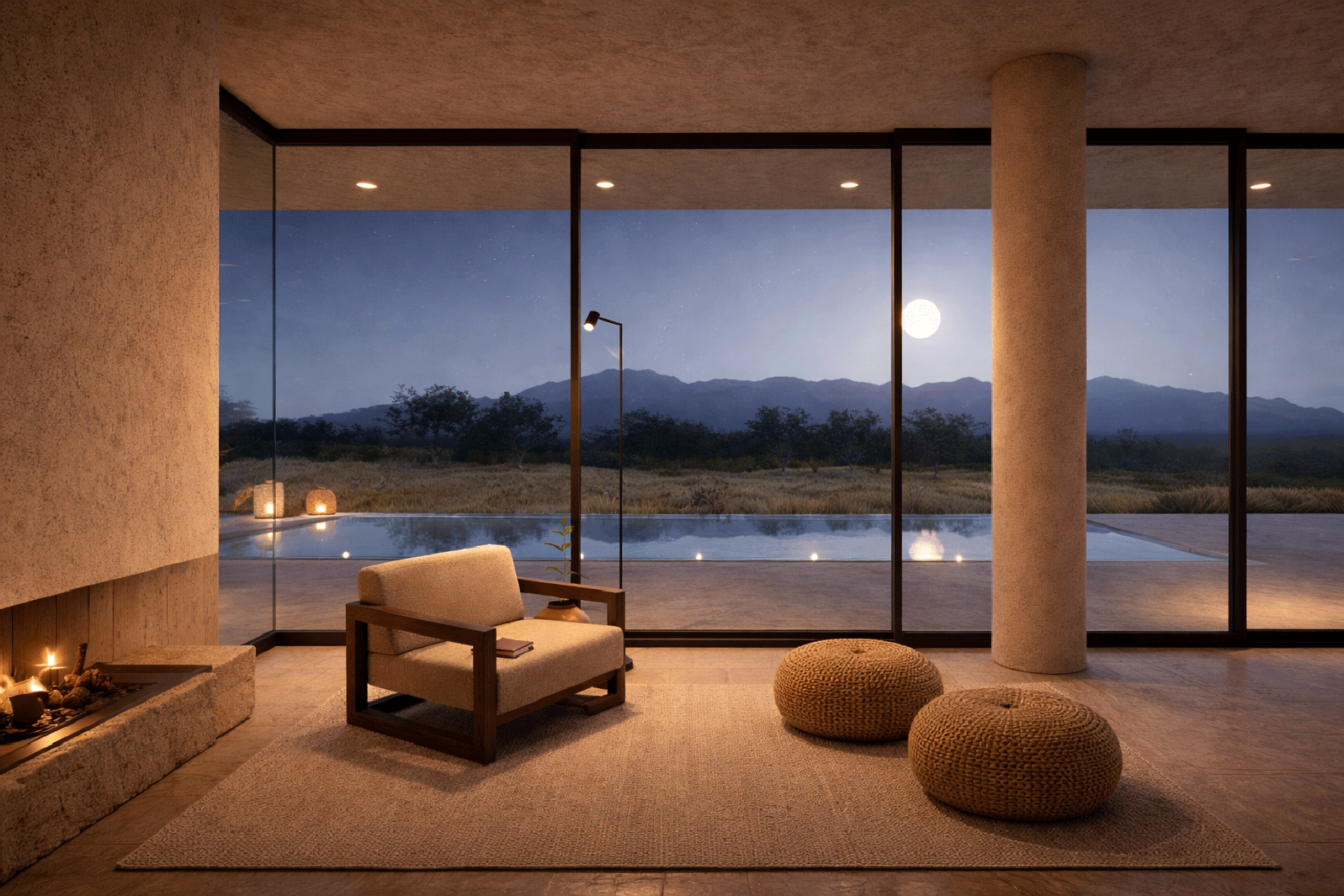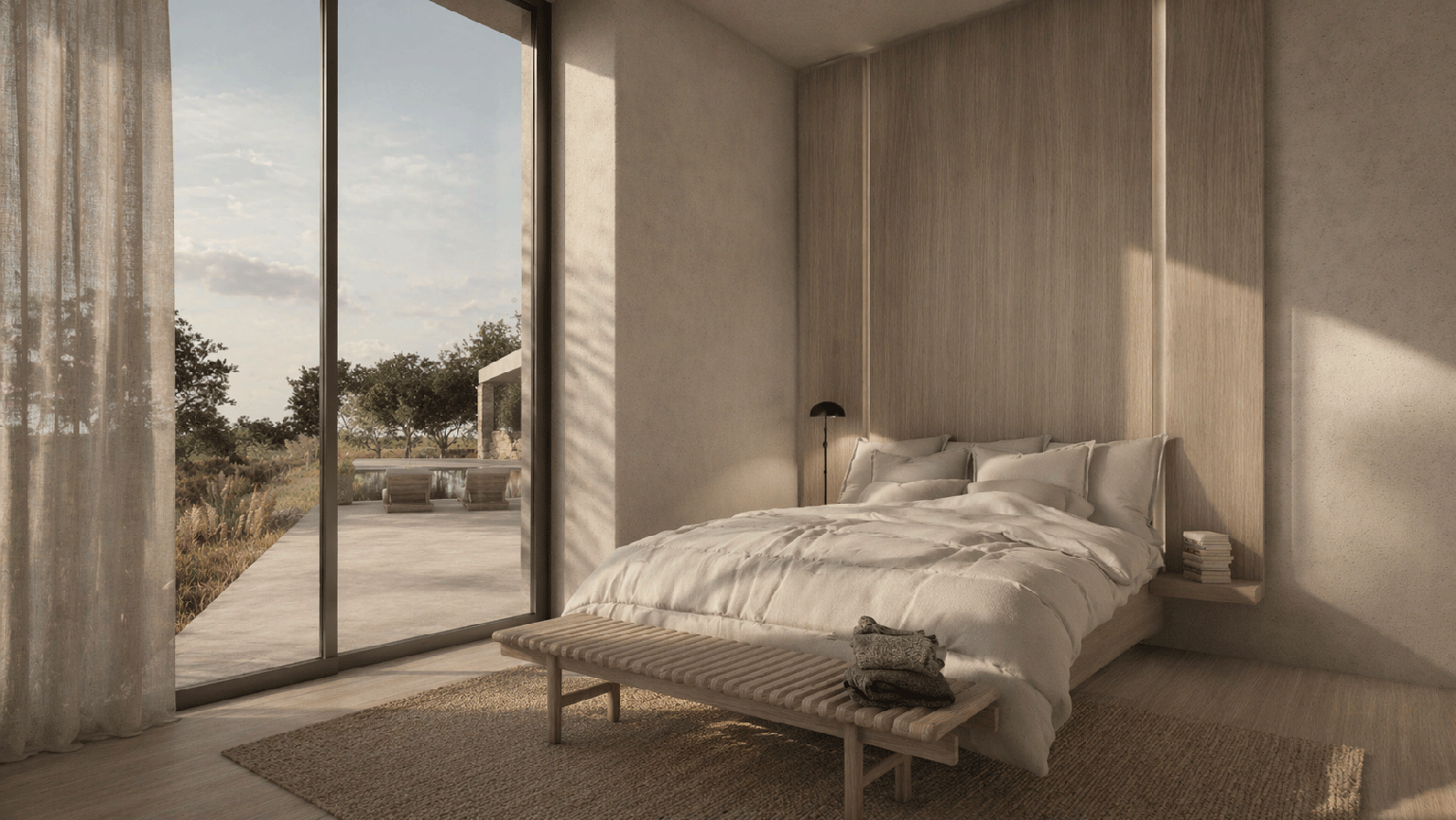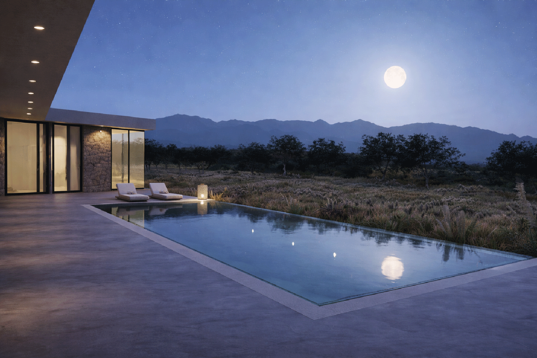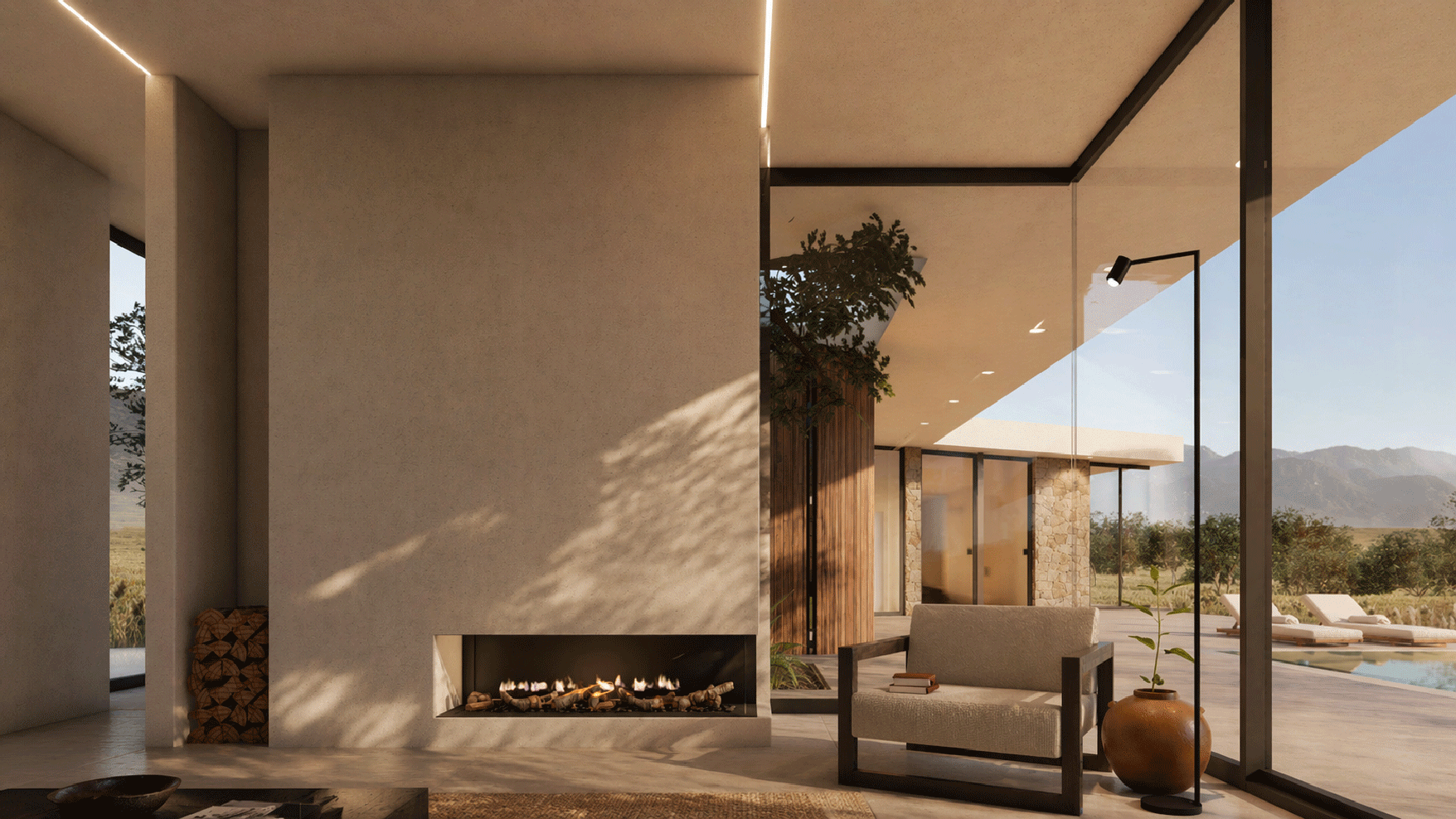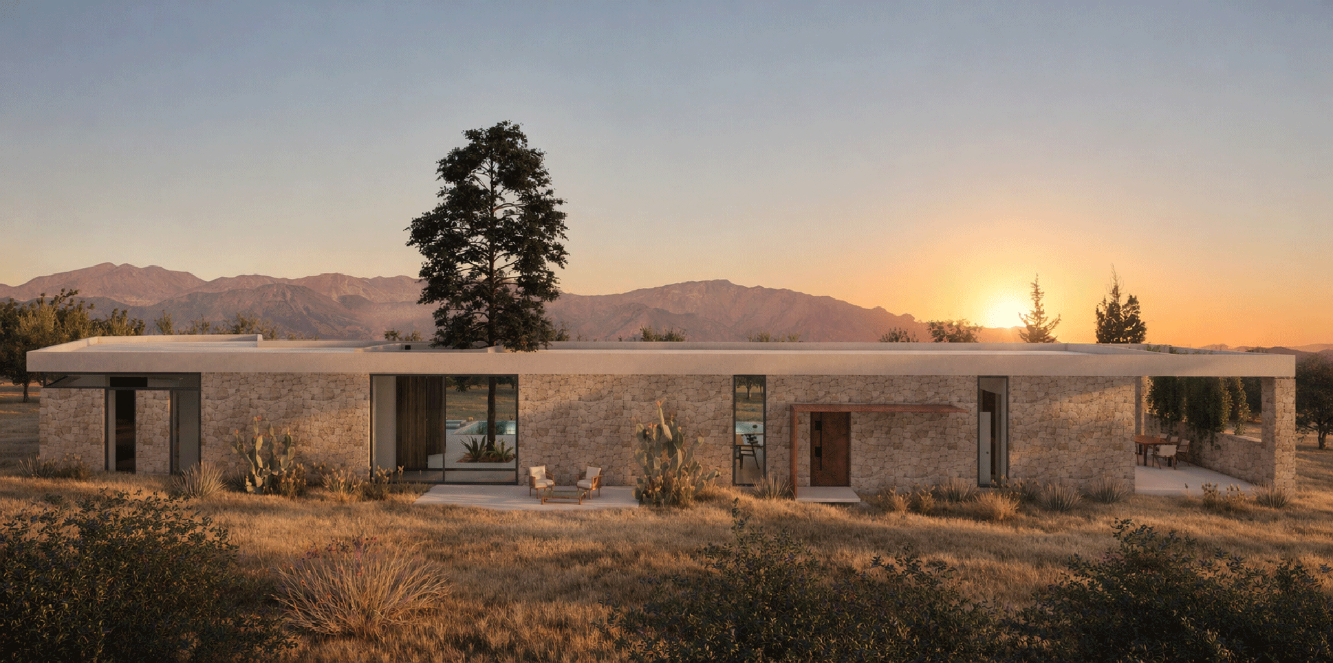 The 50-meter terrace has a swimming pool in the center, positioned in such a way that the entire mountain range of the White Mountains is reflected on it and makes this view visible through all the areas of the building. To walk the house from one end to the other, one would need to walk 68 meters and the closer one gets to the center, the osmosis of the users intensifies, while the further one moves away from the center, the more privacy. Going out into the courtyard, one is essentially in the outdoor living room with its summer uses and going down five steps from the veranda, one meets the nature, as there is no other intervention in the rest of the property.