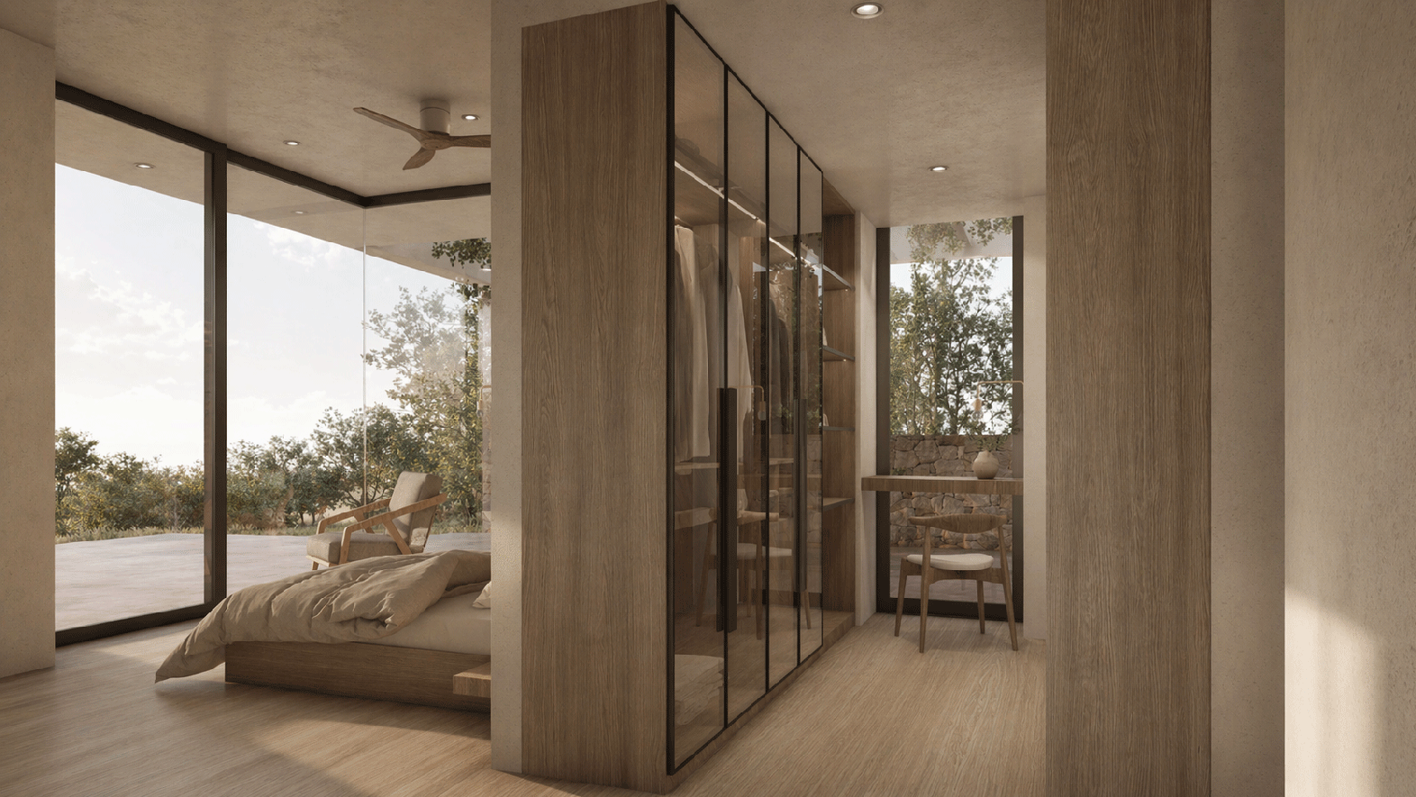 The entrance spot is in the middle of the building, leading to the kitchen area, the dining room, the living room and the guest wc. Behind the kitchen is a large bedroom with bathroom, wardrobe room and office, as well as a semi-outdoor seating space. This space meets the couple's needs for complete isolation and work, inside or outside, while staying at home, keeping a distance from other users.