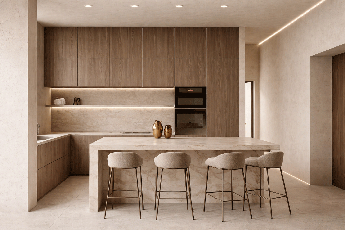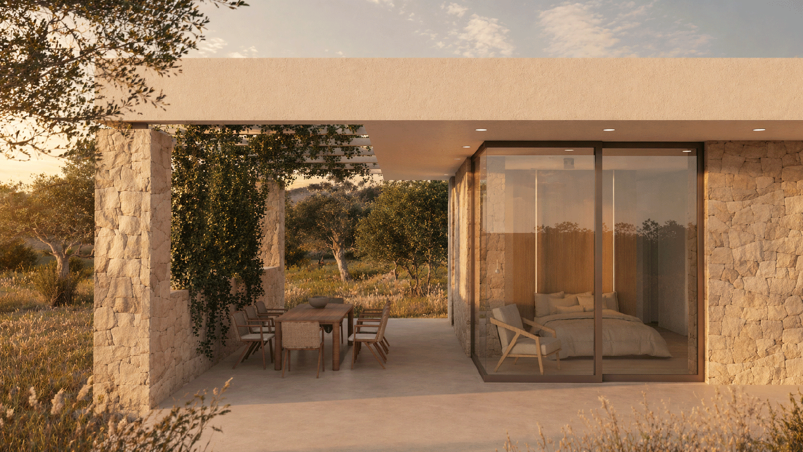 The plot is flat and is surrounded by two roads, one of which is relatively a busy road. On the other two sides we have the forest and an organic olive grove. Analyzing the data, we designed a ground-floor volume of a building which in a U shape creates a filter from the streets and an introversion towards the courtyard spaces that print all the rooms of the house. The building is made of stone, using stones from the area, with exposed slab and inverted reinforced concrete beams.