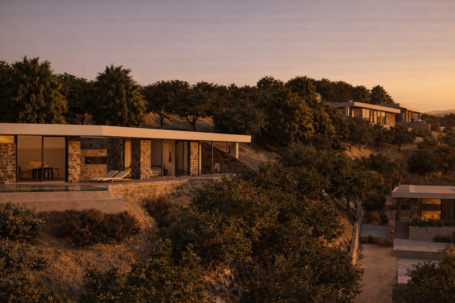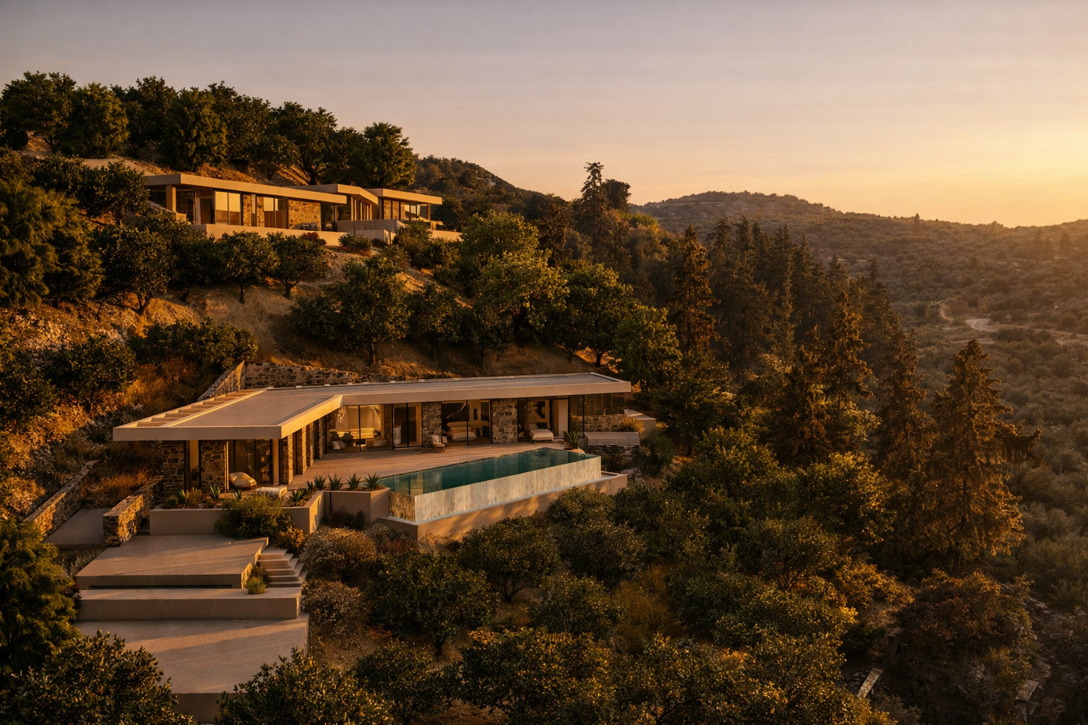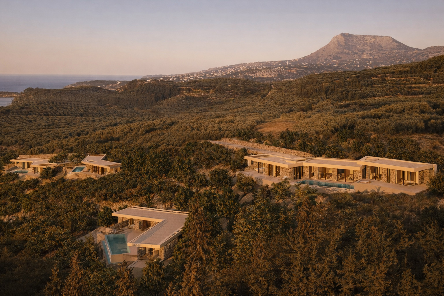 On four independent plots outside the settlement boundaries, each measuring two acres, we were commissioned to design a complex of autonomous, luxury residences. The project site lies on a steep hillside at the edge of a pine forest, oriented toward the west and north. Our design aimed to ensure that each residence enjoys views toward the lush Apokoronas plain and the western sunset, the entrance of Souda Bay and the open sea to the north, as well as the panoramic, imposing presence of the White Mountains to the south. At the same time, we sought maximum privacy, ensuring that the residences are not visible to one another and remain hidden from the road.
