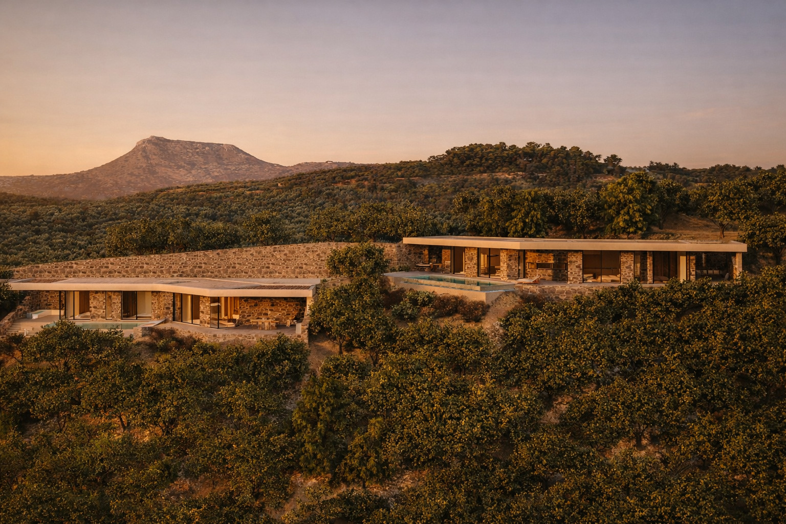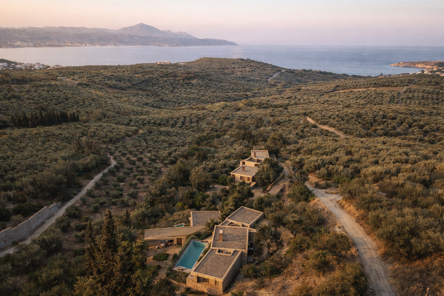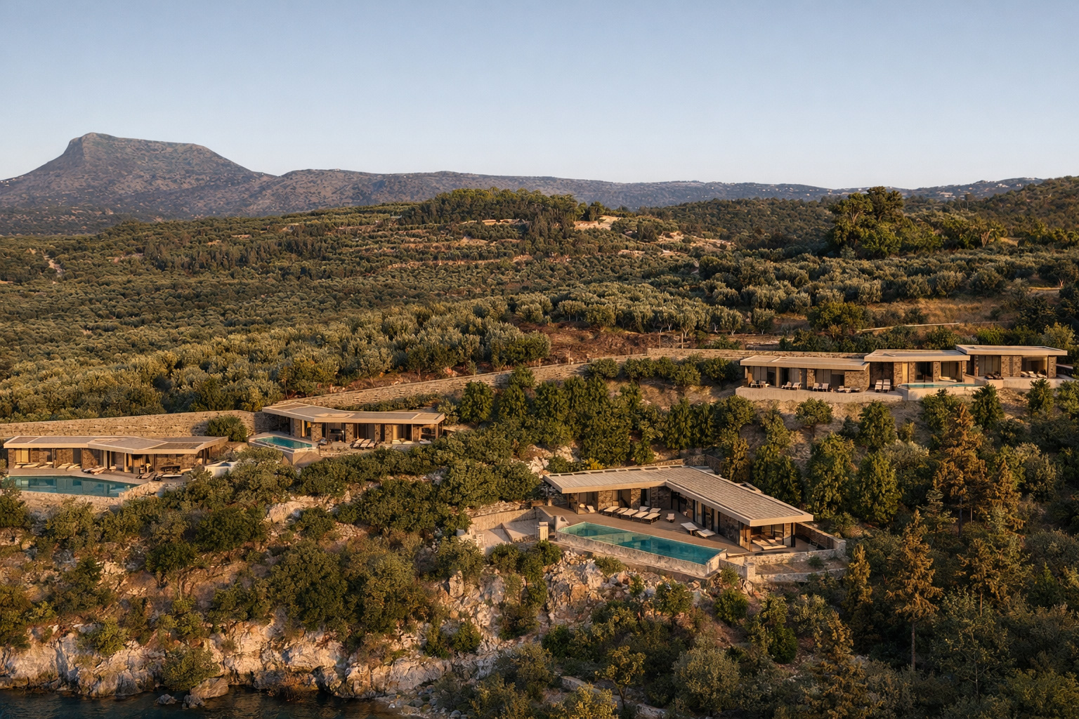 On four independent plots outside the settlement boundaries, each measuring two acres, we were commissioned to design a complex of autonomous, luxury residences. The project site lies on a steep hillside at the edge of a pine forest, oriented toward the west and north. Our design aimed to ensure that each residence enjoys views toward the lush Apokoronas plain and the western sunset, the entrance of Souda Bay and the open sea to the north, as well as the panoramic, imposing presence of the White Mountains to the south. At the same time, we sought maximum privacy, ensuring that the residences are not visible to one another and remain hidden from the road.