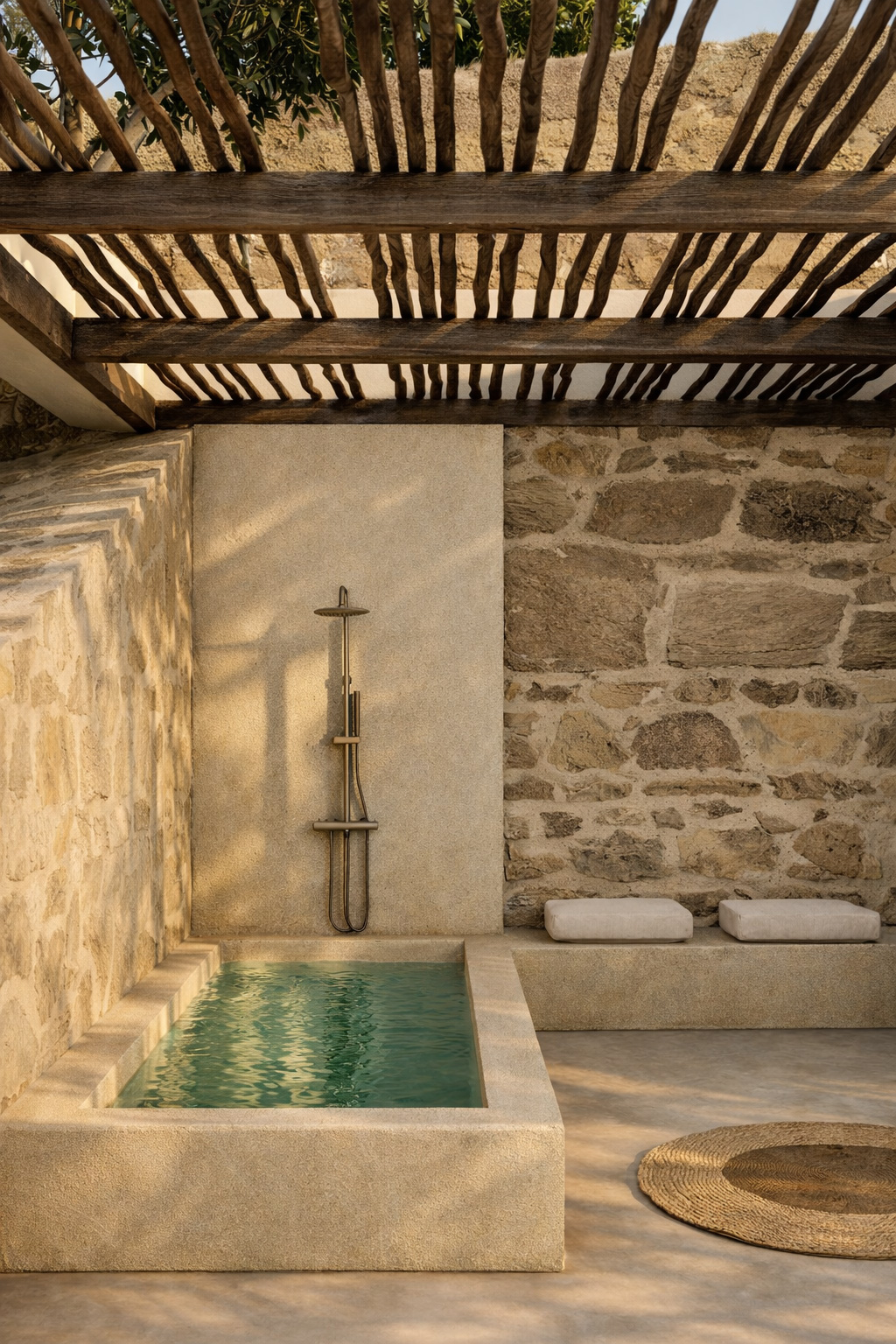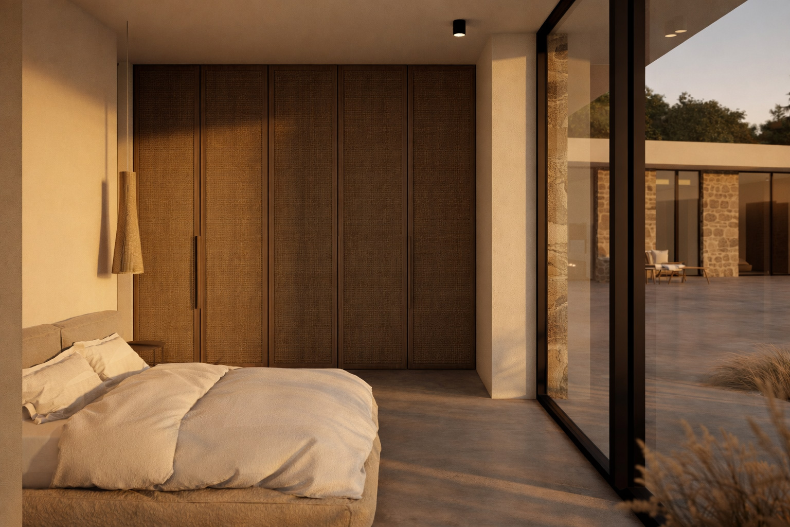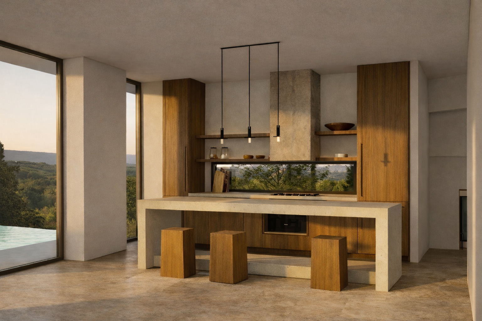 Inside and out, a cement‑toned industrial floor is used, while the walls and ceilings are finished in traditional white plaster. Both the fixed and movable furnishings, as well as the exterior pergolas, are made of natural wood, reinforcing the use of natural materials throughout.
