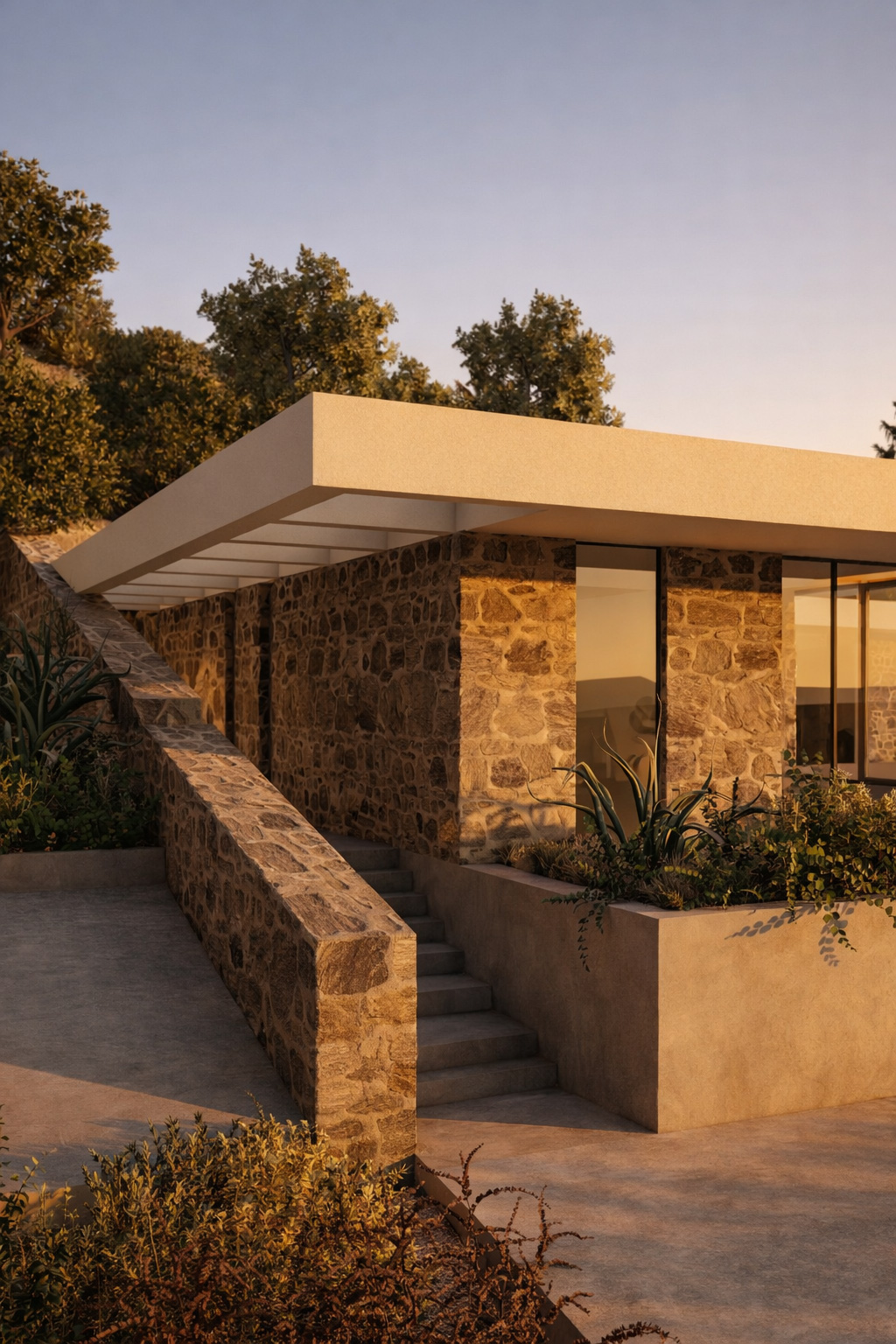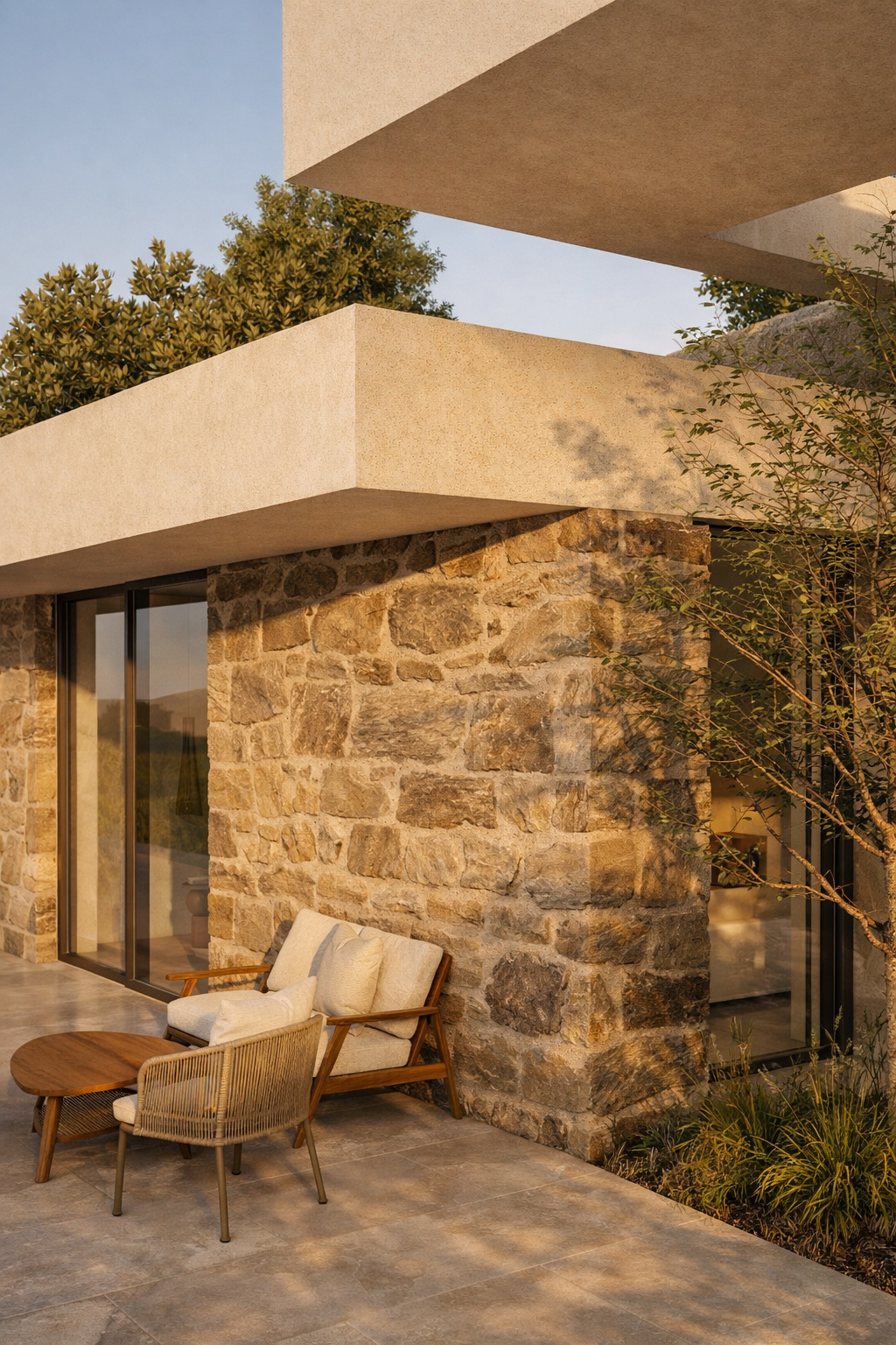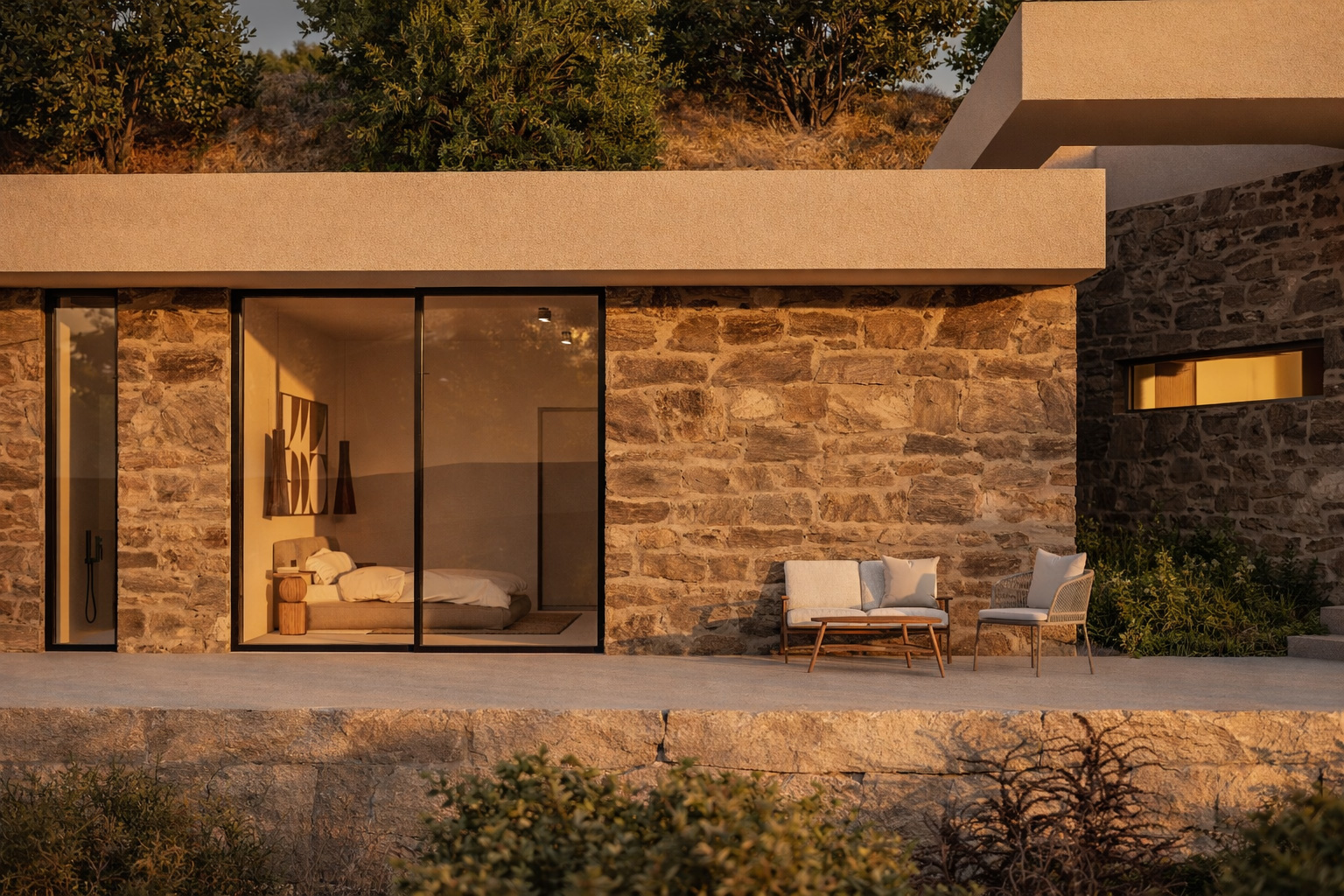Southwest of the two residences, at a lower level, lies the large Γ-shaped home. A cut was first made into the slope, along with a stone retaining wall. The building was placed at a distance and at a different angle from the tall stone wall that holds the mountain, creating the entrance to the residence and a rear courtyard that brings cross-ventilation and openness to all spaces. The living areas were placed centrally, with the four bedrooms positioned at the ends, achieving a gradient of privacy from the center outward. All spaces open toward the “embrace” of the Γ-shaped layout with the pool, while two private patios at the ends serve the master bedrooms.