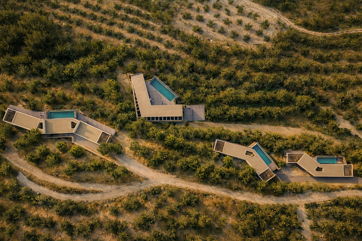 The contour lines indicated the ideal placement of the buildings, allowing us to minimize intervention in the landscape—both in positioning the volumes and in creating independent access routes for each home, which proved to be a particular challenge.