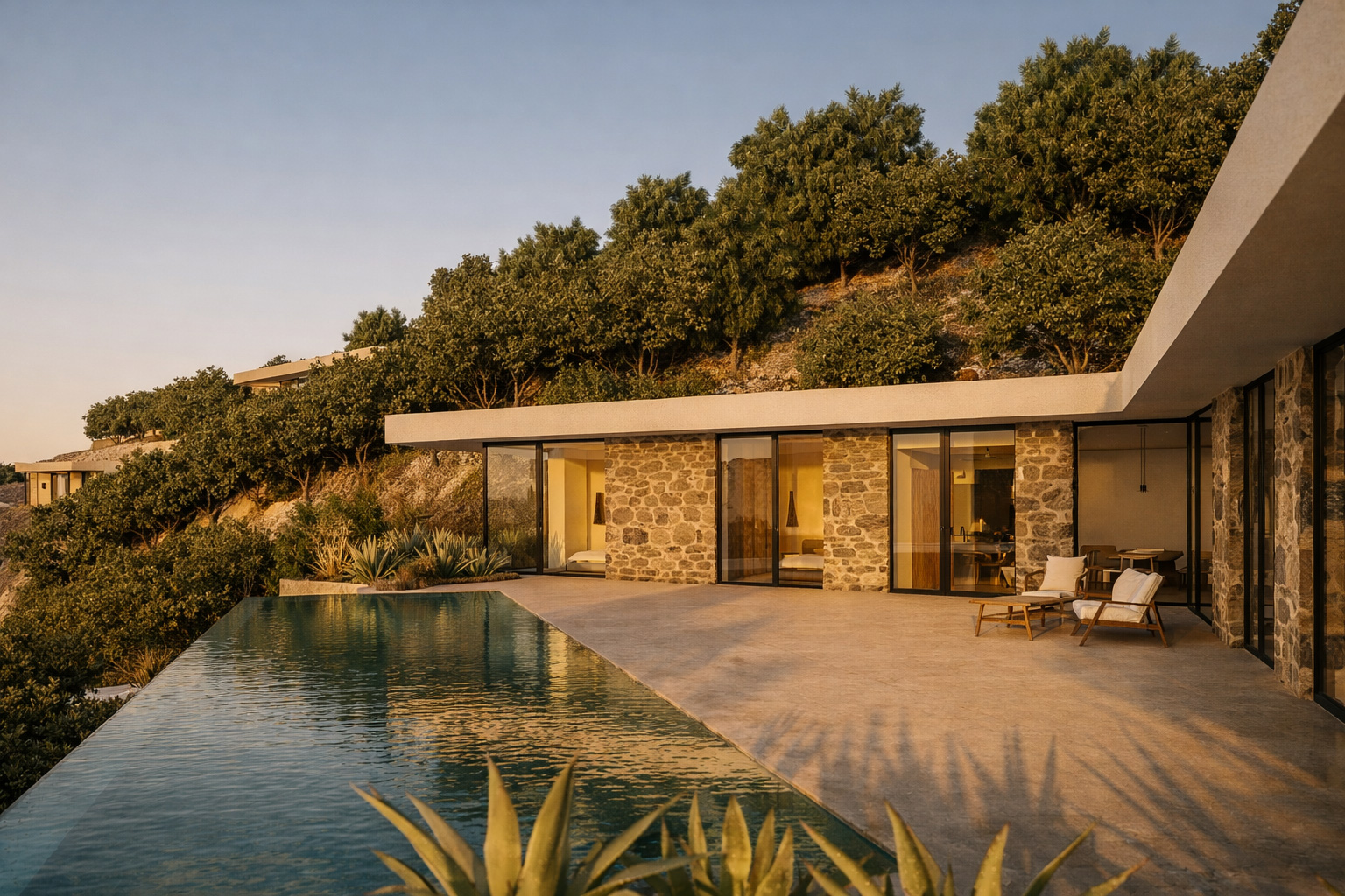 The design and placement of the buildings were carried out with minimal intervention on the site, using soil from the excavations for backfilling and stone sourced from the plot or the surrounding area. The buildings “fit” between the pine trees without the removal of a single one. Each home includes a rainwater collection tank to reduce water consumption for the pools, while the natural vegetation remains untouched. Thermal insulation, combined with orientation, cross‑ventilation, and technologically advanced frames and glazing, places the residences in energy class A+.
